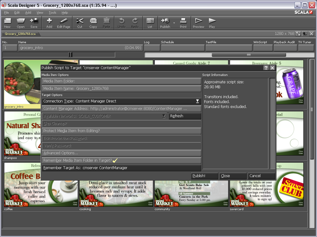 Publish Your Work - When complete, publish your content to Scala Content Manager where it is scheduled and distributed to Scala Players.